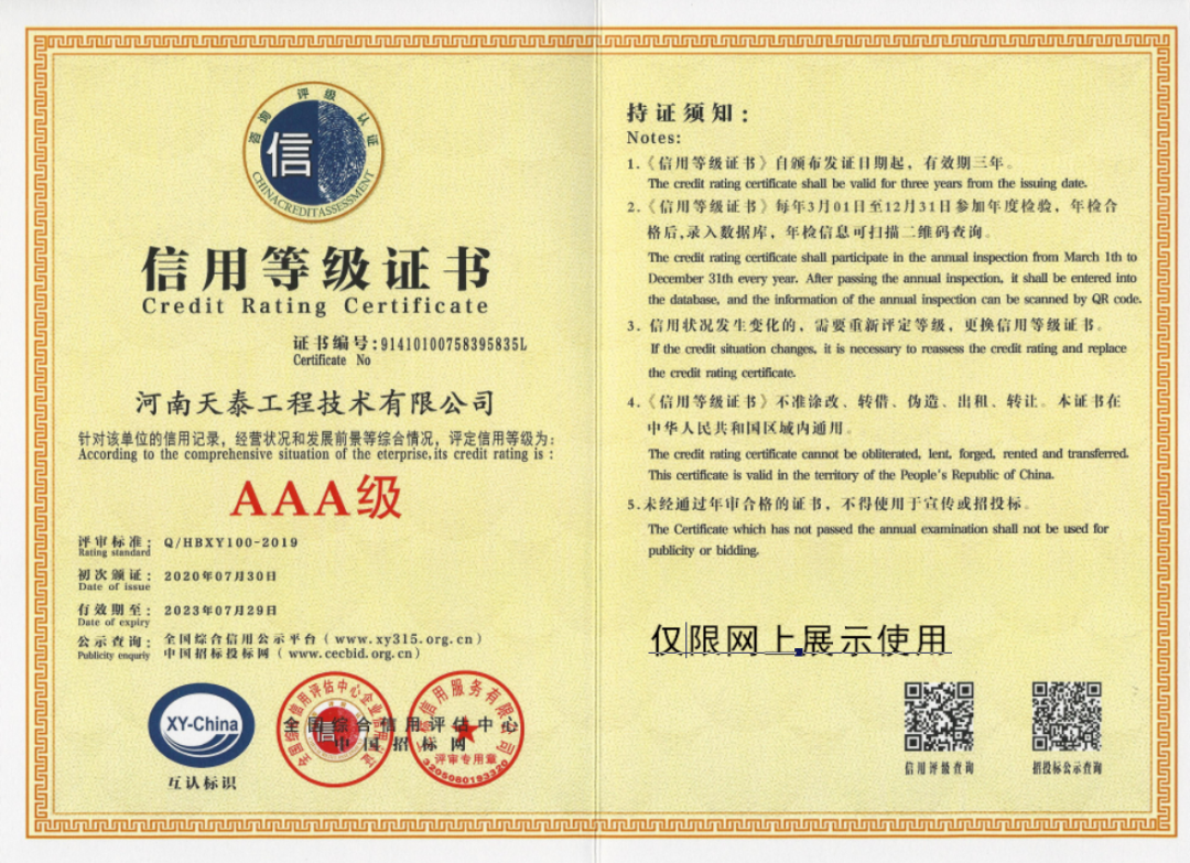 2020年7月31日,河南天泰工程技术有限公司通过全国综合信用评估中心 “企业AAA信用等级”的审核评定,取得了“AAA”信用等级证书。